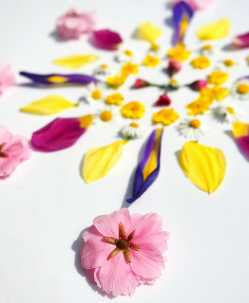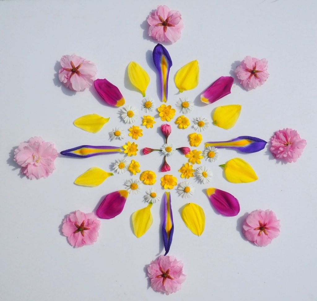 The Spring flower mandalas below were created mindfully and intentionally to honour Easter / Ostara, or the Spring Equinox, which is when pagans generally celebrate this festivity. I used flowers foraged responsibly from my garden and locality and surrendering creative control, I allowed the shapes to form organically and intuitively. I did however plan to work with the four fold geometry of the cross, symbolising balance, harmony and the meeting of heaven and earth.