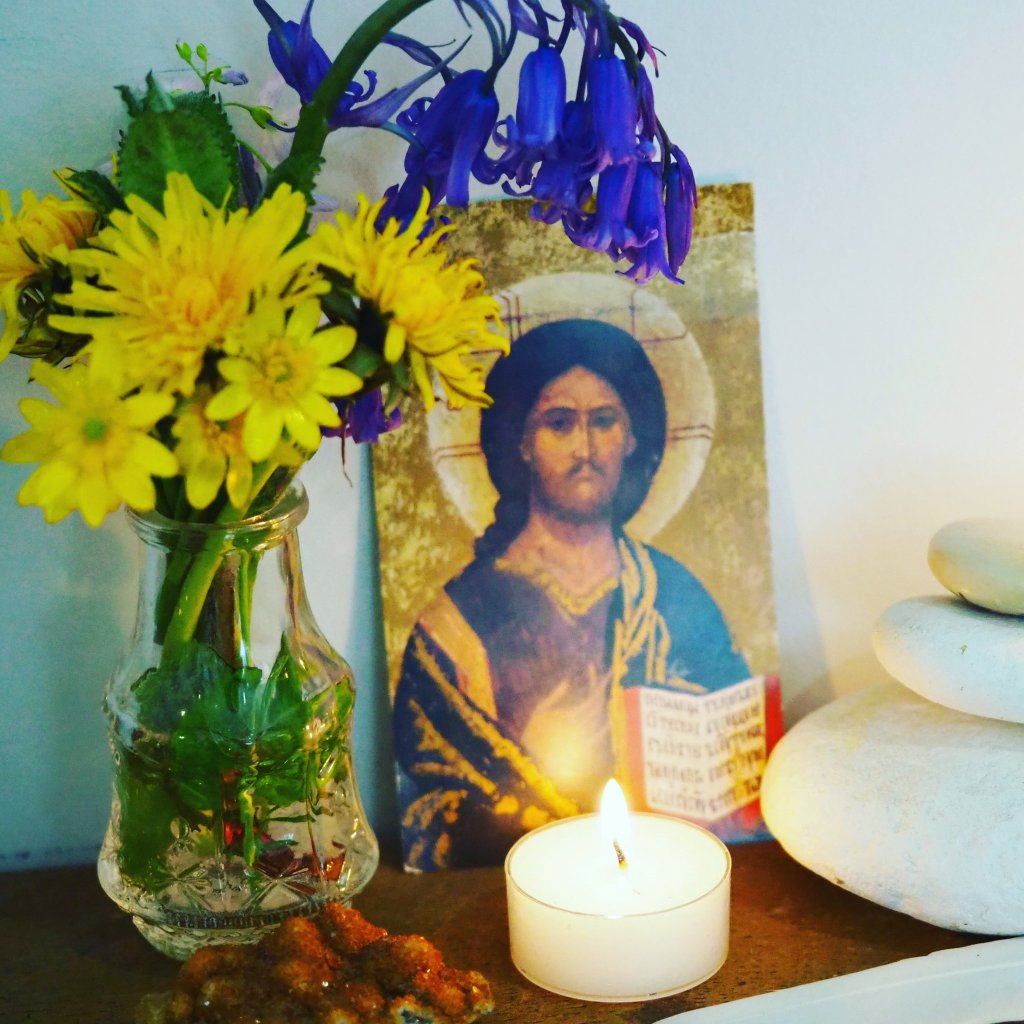 Each seasonal celebration I relish the opportunity to adorn my mantle in a beautiful array of seasonal flowers, crystals and natural objects to represent the energy of the festivity as well as the four elements. To honour the essence of Beltane I chose to create a balance of both female and a masculine sides to my altar. I picked yellow flowers to adorn the masculine side, along with a citrine crystal and Jesus image. The feminine was represented by Mary Magdelene, roses, rose quartz crystals and a heavenly Beltane incense made by StarChild. Traditionally yellow flowers were picked at this time to symbolise the sun and left on neighbours doorstep as a good luck blessing, such a sweet idea.
